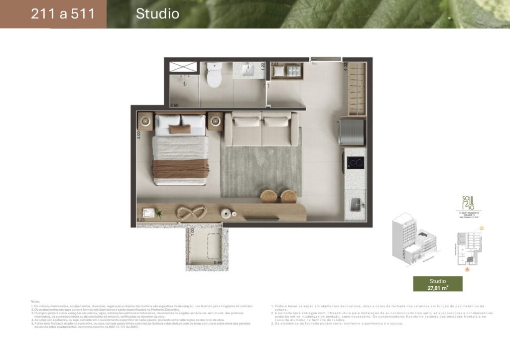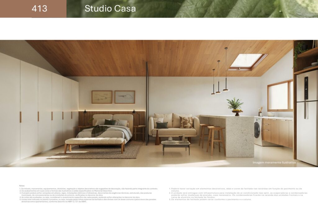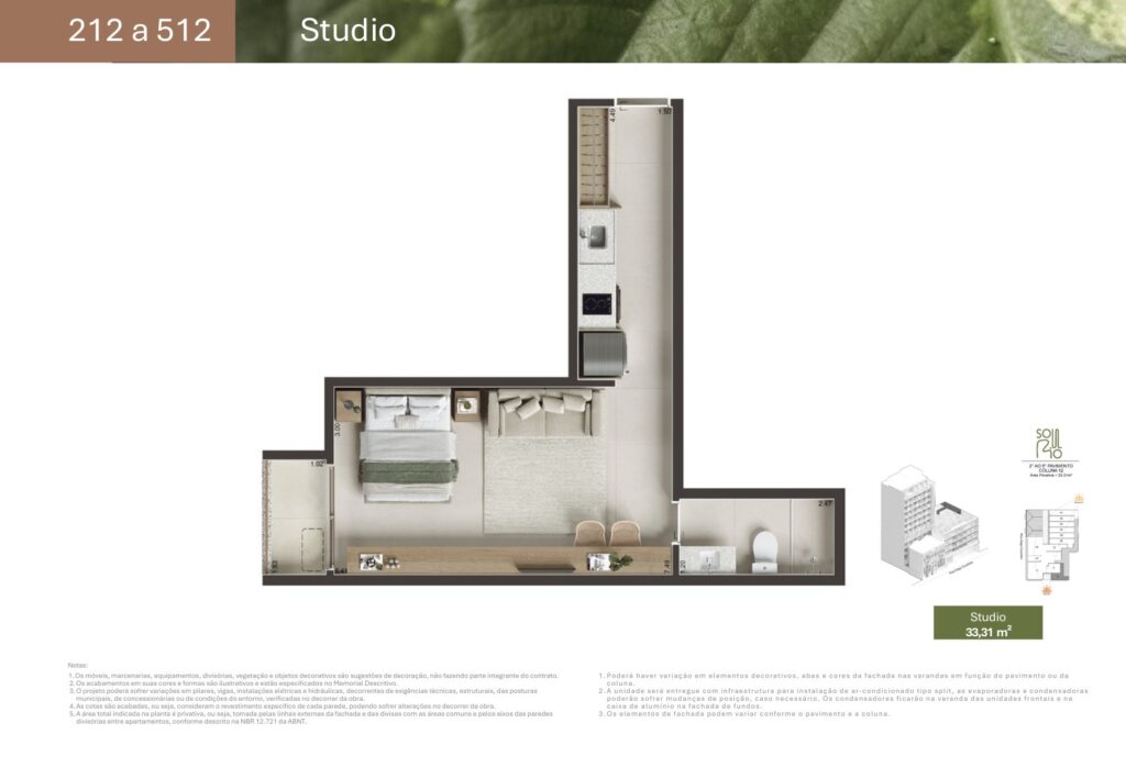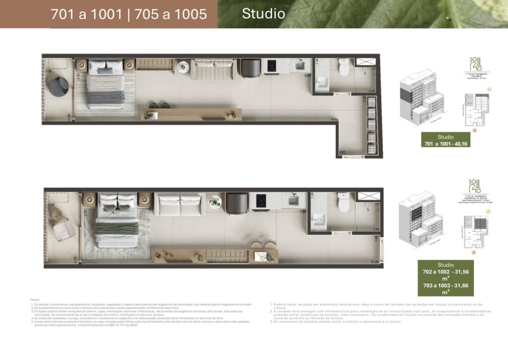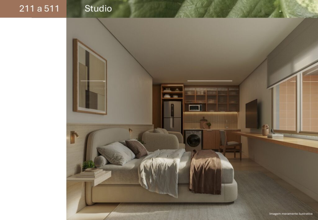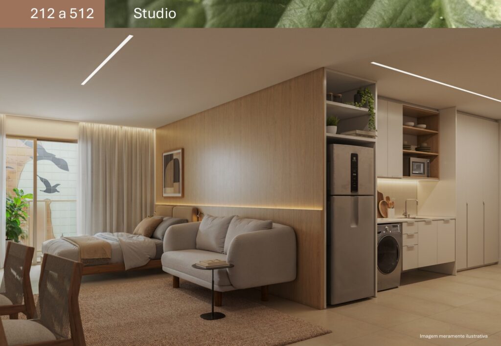 - 07 unidades Studio sem varanda com metragens de 27,81 m² a 44,33 m²