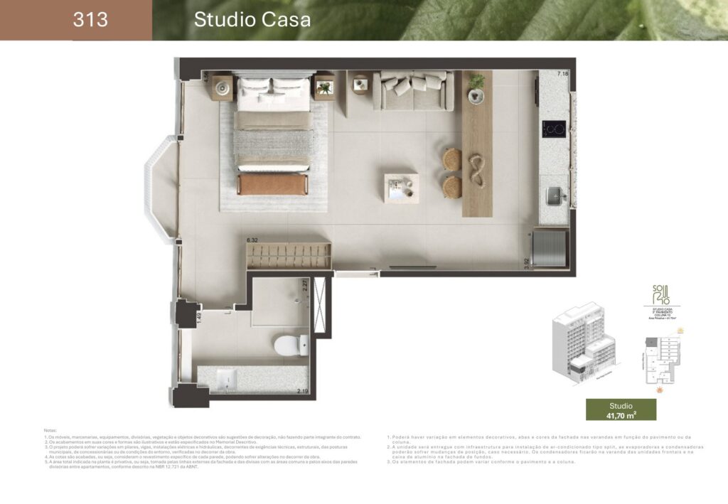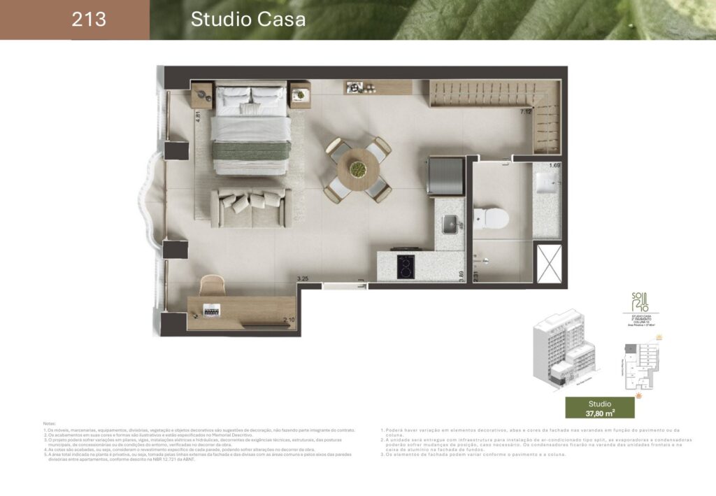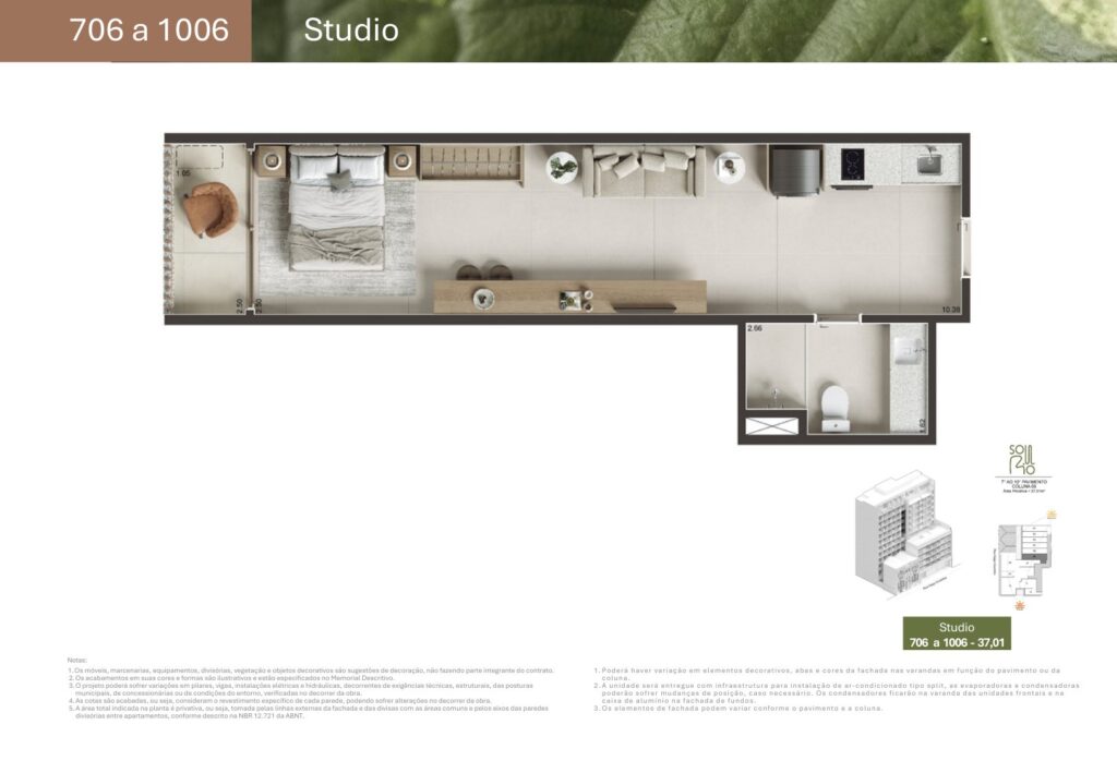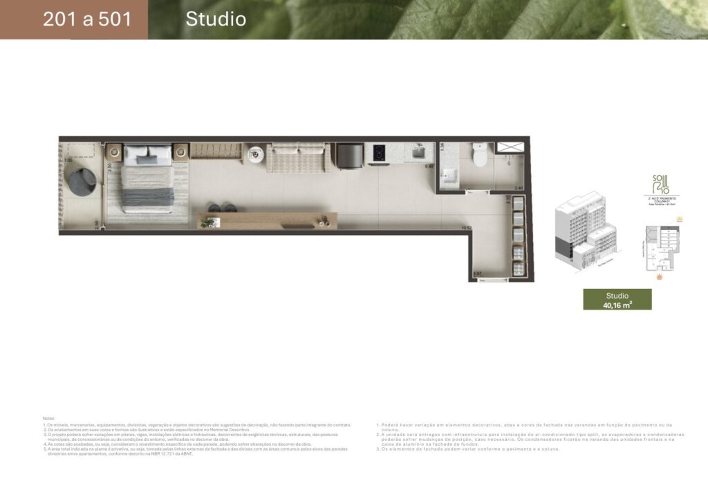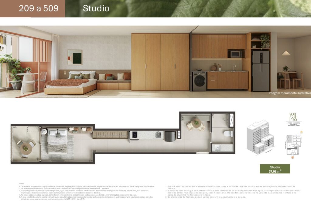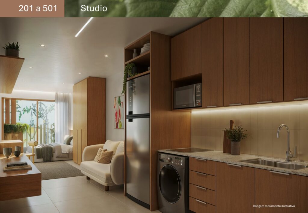 - 07 unidades Studio sem varanda com metragens de 27,81 m² a 44,33 m²