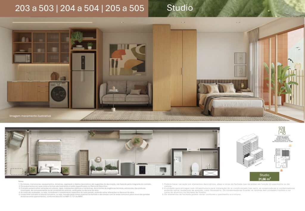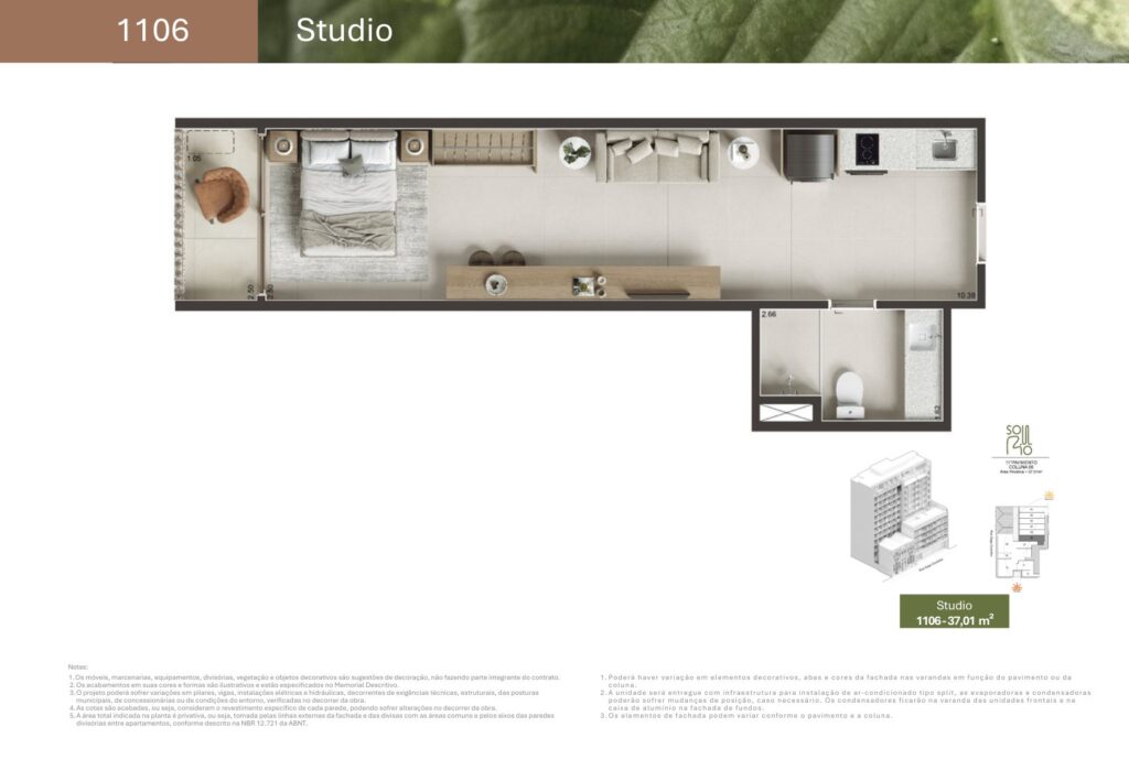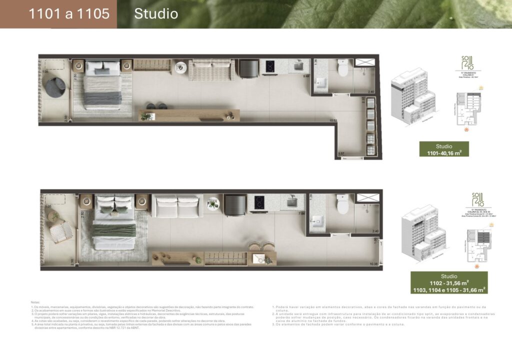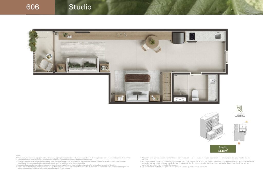 - 74 unidades Studio com varanda com metragens de 29,78 m² a 44,15 m²