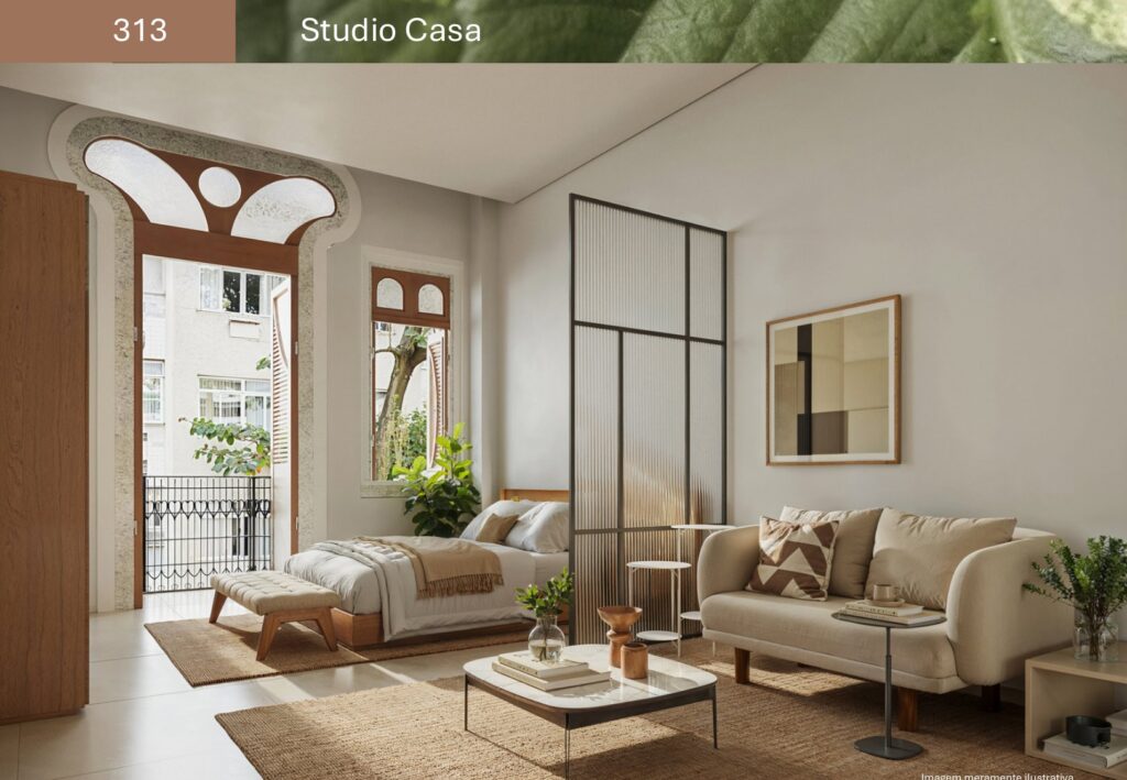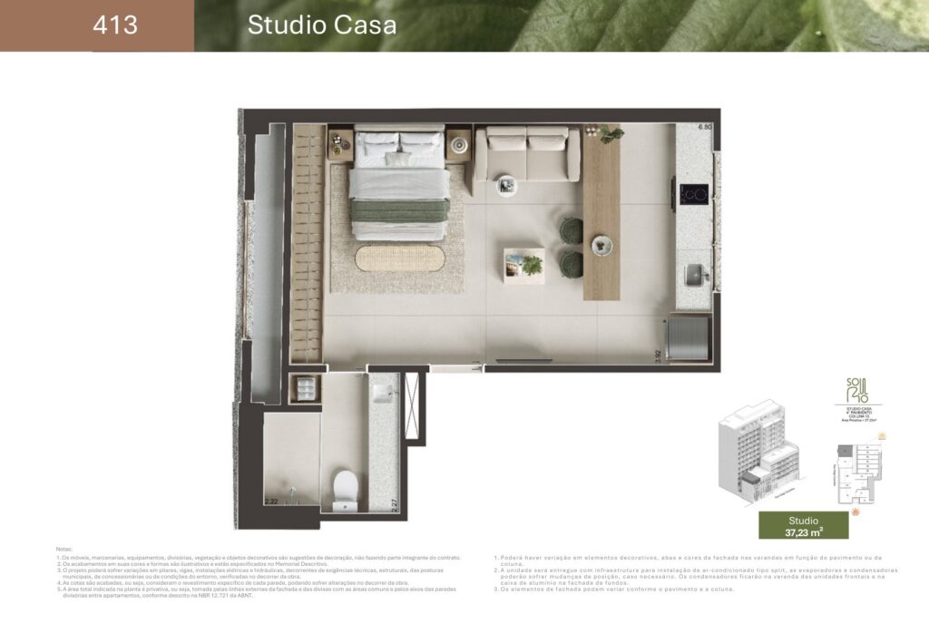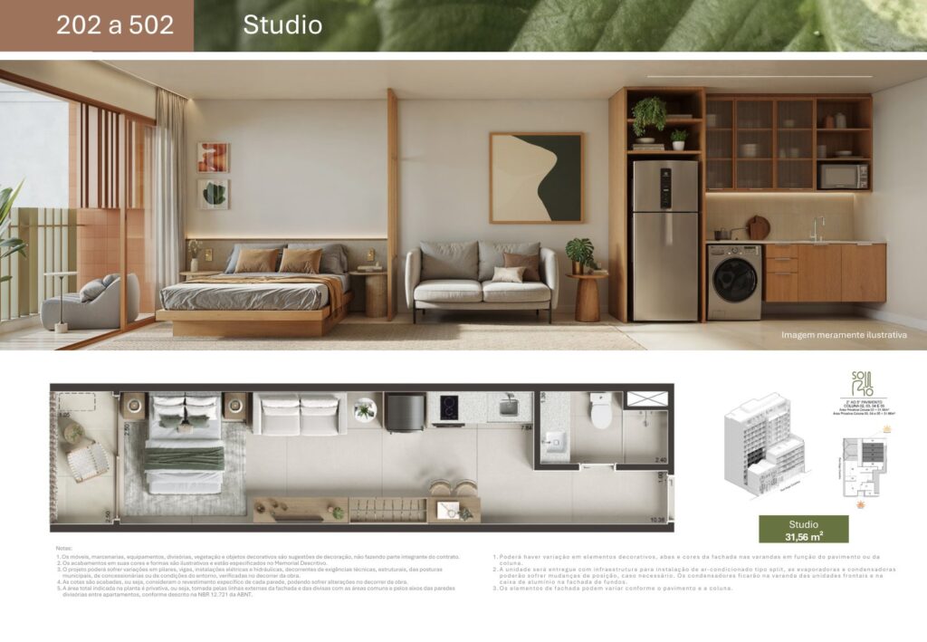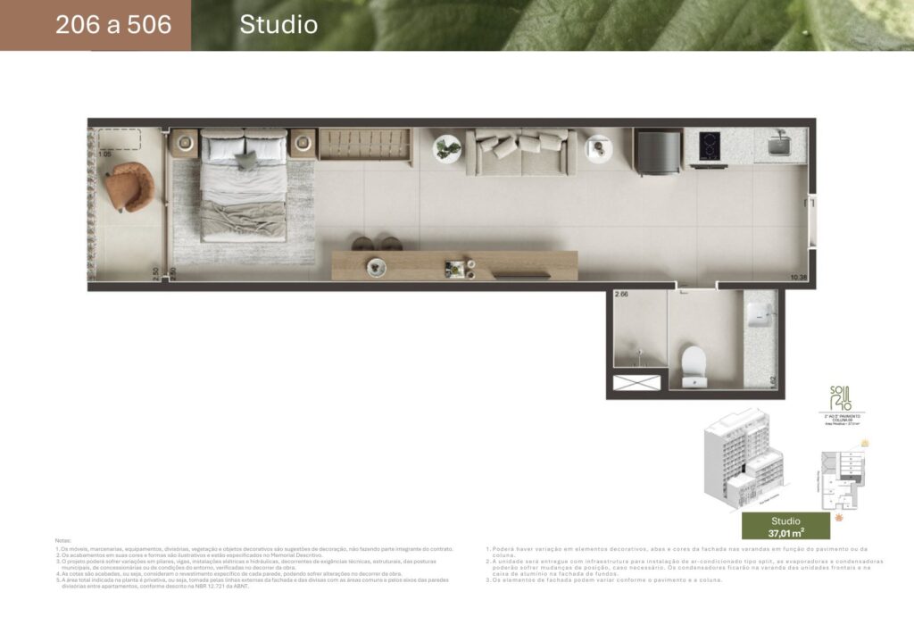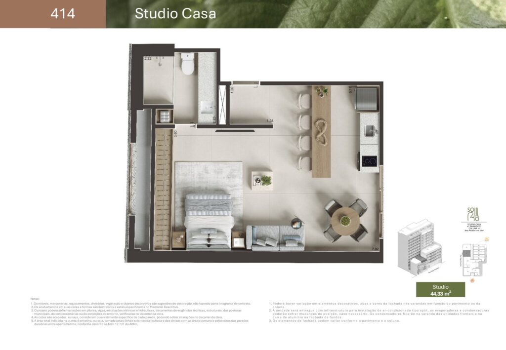 - 74 unidades Studio com varanda com metragens de 29,78 m² a 44,15 m²