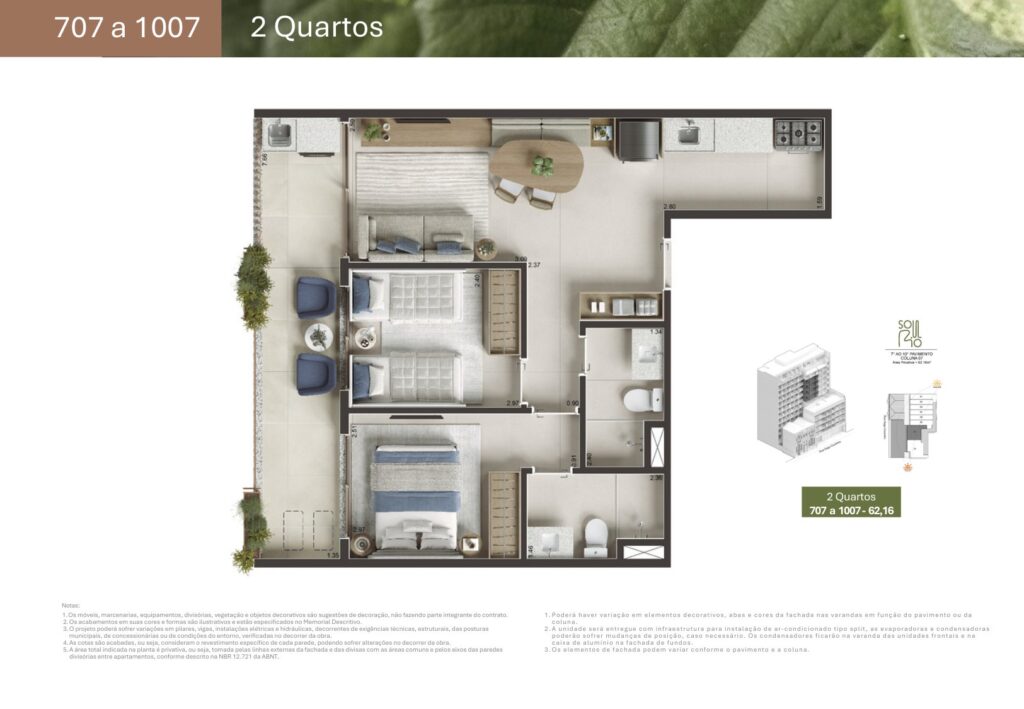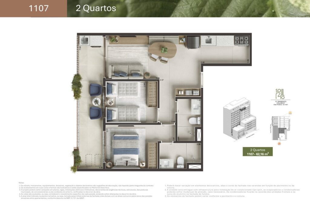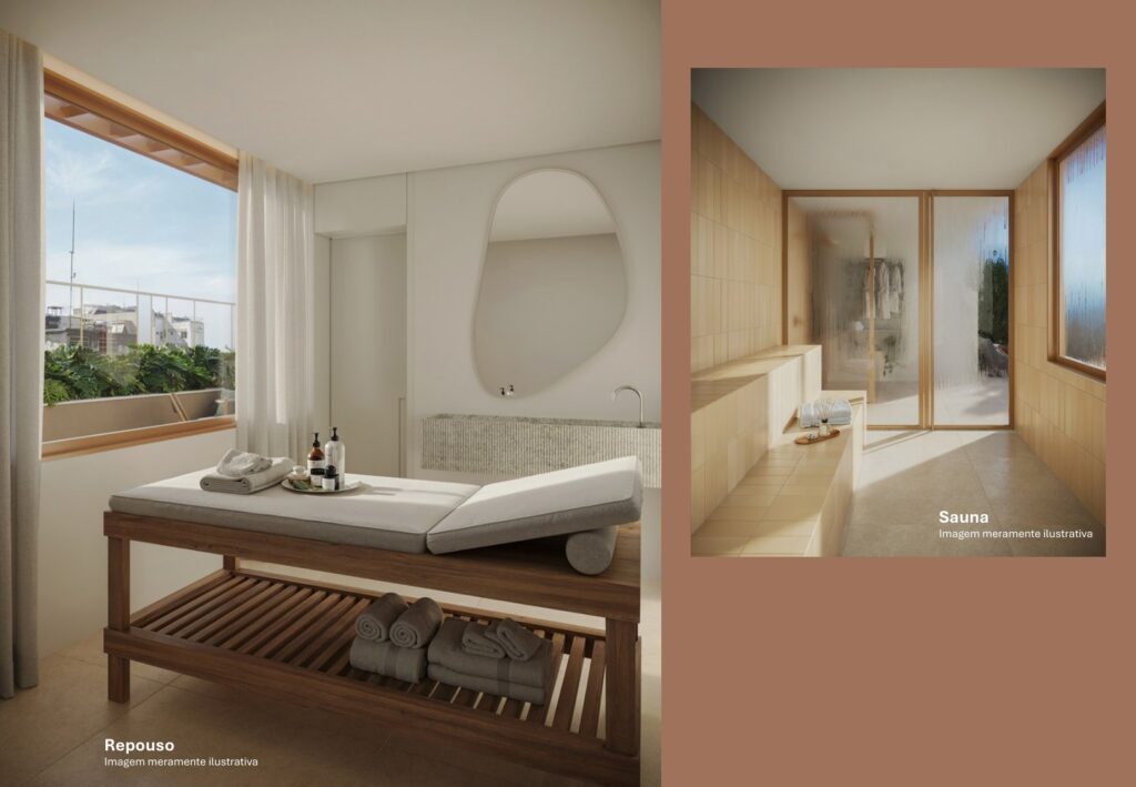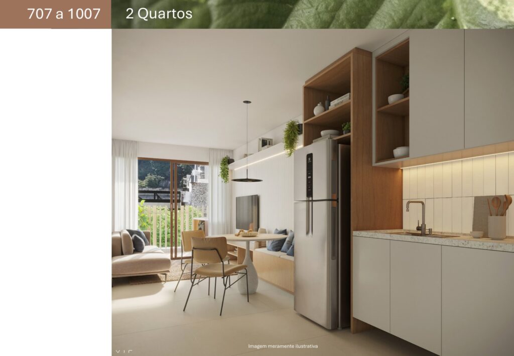 Para quem precisa de mais espaço, o Soul Rio Gago Coutinho também oferece apartamentos de 2 quartos com suíte, com metragens que variam de 62,16 m² a 82,65 m². Os apartamentos, são ideais para famílias ou para quem deseja mais conforto no dia a dia. Outro diferencial importante é que todas as unidades de 2 quartos possuem vaga de garagem, algo bastante valorizado na Zona Sul do Rio de Janeiro.