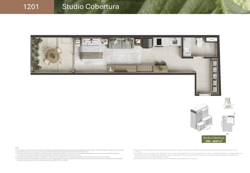 - 02 coberturas studio com 40,01 m² e 42,54 m²